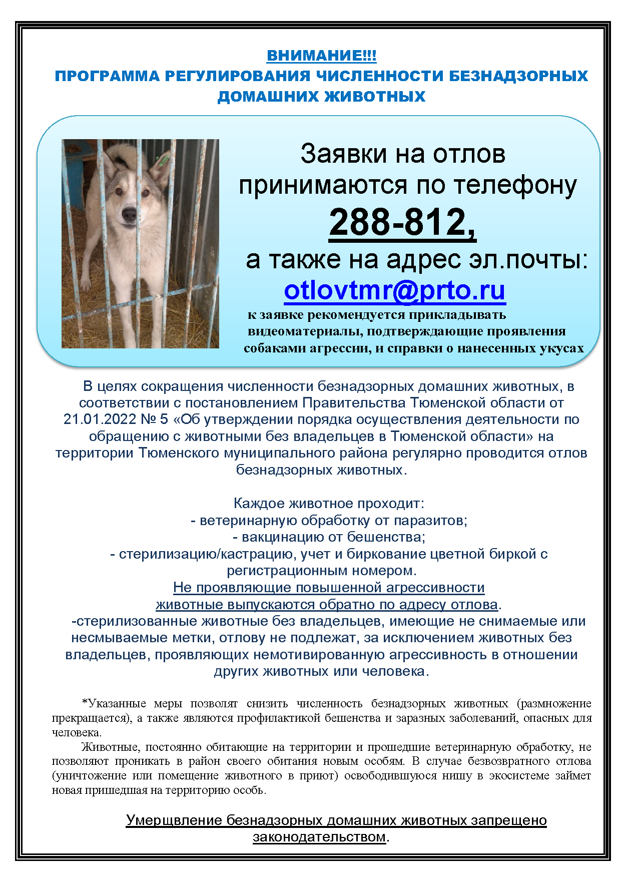 Заявки на отлов принимаются по телефону 288-812, а также на адрес эл.почты: otlovtmr@prto.ru